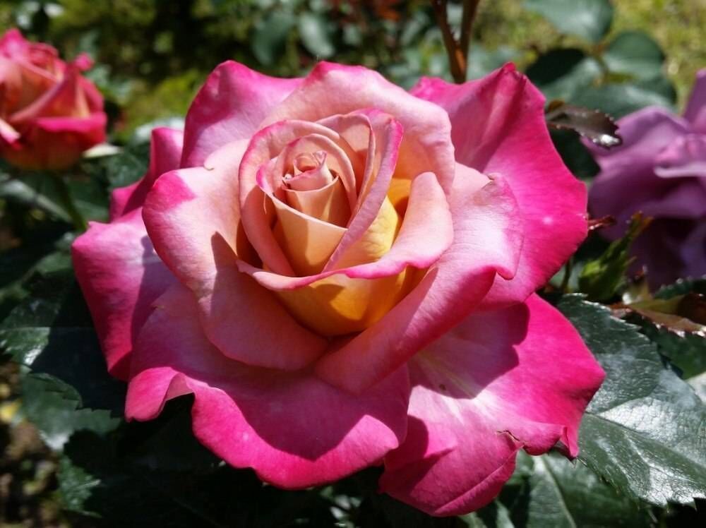 Цветки махровые, чашевидной формы, достигают диаметра до 12см. Имеют ярко-фиолетовый цвет с персиковым оттенком в серединке. Источают очень сильный аромат. Цветёт на протяжении всего сезона практически непрерывно. Куст хорошо держит форму и не падает, имеет высоту до 90см. и ширину до 80см. Хорошо противостоит болезням и имеет хорошую зимостойкость.